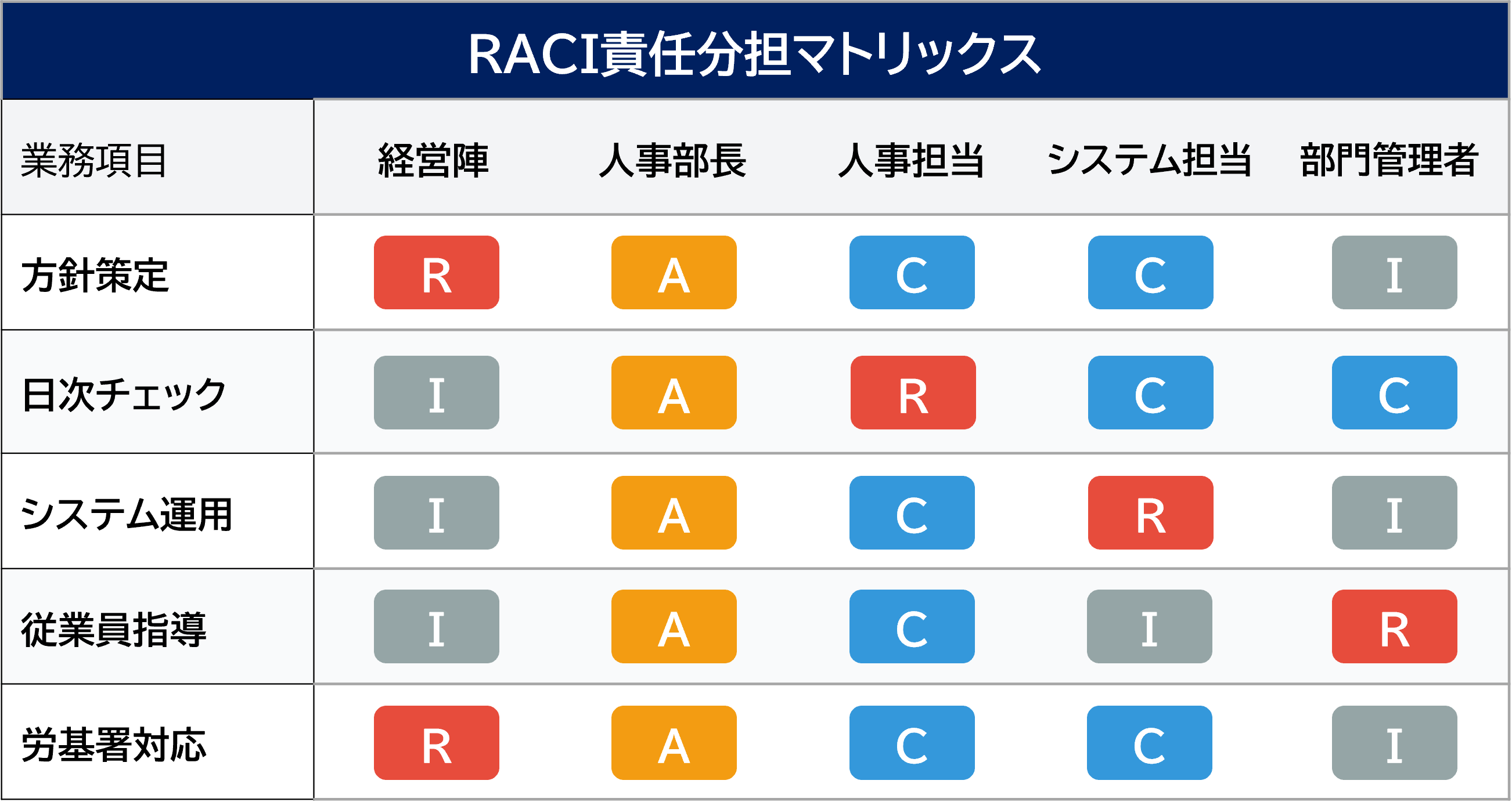 効果的な打刻忘れ対策を実施するためには、関係者の役割と責任を明確にすることが重要です。以下のようなRACIマトリックス(責任分担表)を活用することで、各担当者が何をすべきかを明確にし、対応の抜け漏れや重複を防ぐことができます。