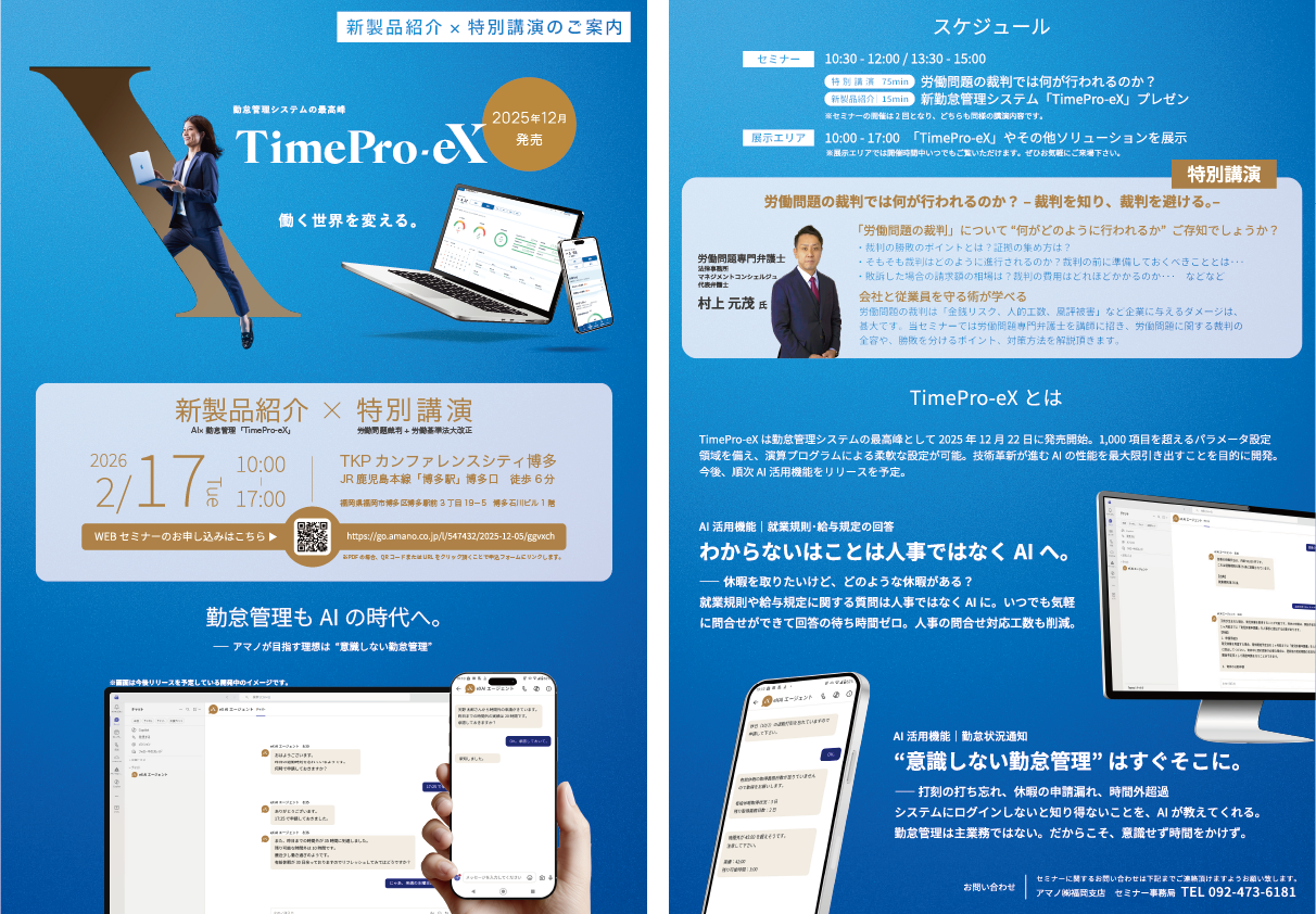 2026年2月17日、福岡の会場にて「「AI×勤怠管理」新勤怠管理システム紹介 ×「特別講演」労働問題の裁判では何が行われるのか。」を開催いたします。